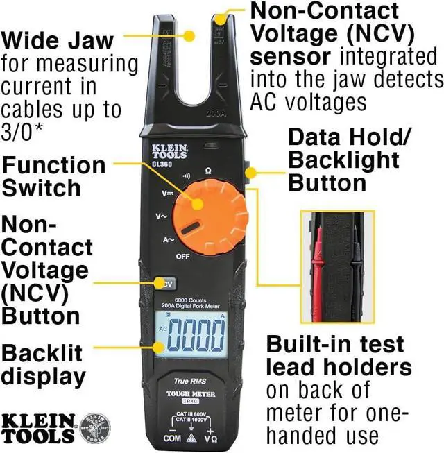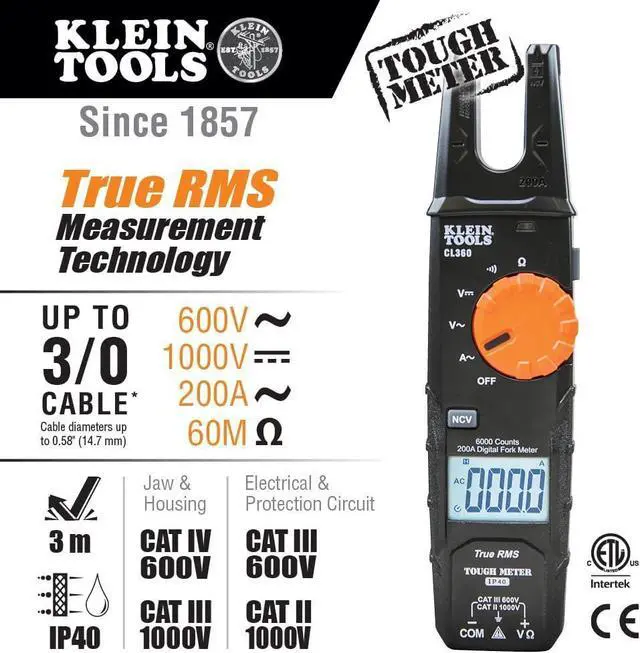 Open Fork Meter with automatically ranging True Root Mean Squared (TRMS) measurement technology for accuracy