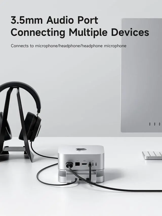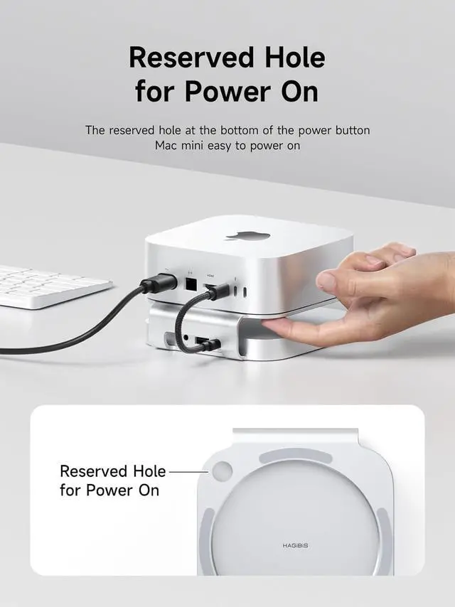 High Efficiency Heat Dissipation: Hagibis Mac Mini M4 Stand has aluminum alloy material which has good heat dissipation effect. And raise the middle design fot better ventilation and heat dissipation. *Note: We have reserved a Mac Mini M4 power on hole in the stand for easy users to power on the Mac Mini M4 at the bottom