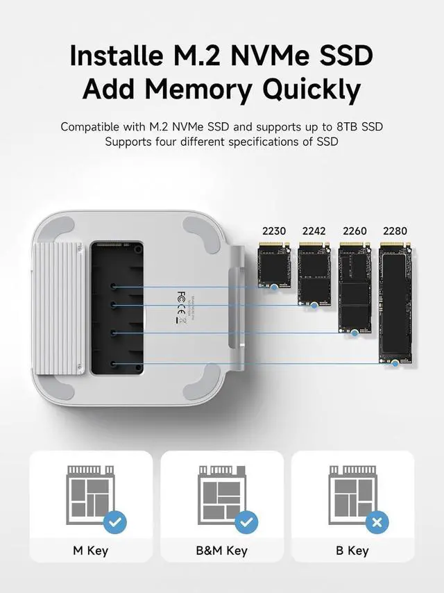 Add Storage Memory: Hagibis Mac Mini M4 SSD Case is compatible with 2230/2242/2260/2280 M.2 NVMe SSD and support up to 8TB SSD with speeds up to 10Gbps. *Note: SSD is not included