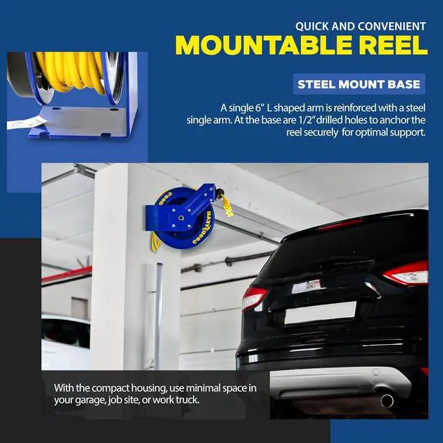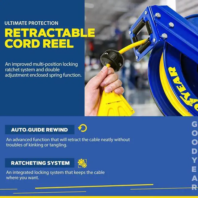 Goodyear Extension Cord Reel Retractable 14AWG x 100' Feet 3C SJTOW Cable Triple Tap Connector Power Rating 125 Volt AC 13 Amp 1625 Watt Industrial Steel Single Arm