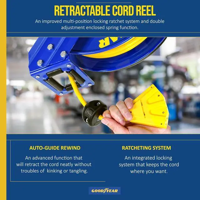 INDUSTRIAL DESIGN - This Extension Cord Reel is constructed of heavy gauge Commercial steel; corrosion resistant powder coating; Spring Driven Auto-Rewind; the reel utilizes double adjustment improved ratcheting that locks the cord at any desired length