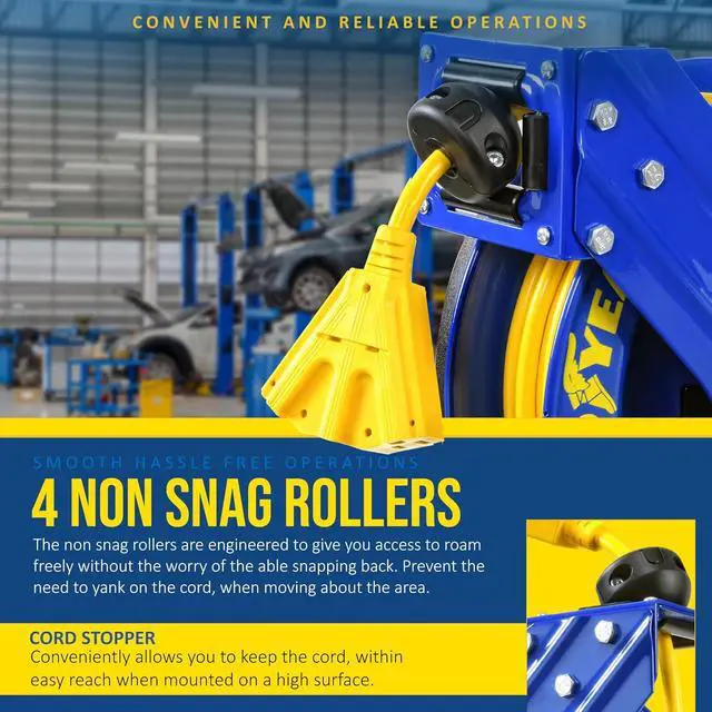 UNIQUE FEATURES - This Cord Reel utilizes with a 3-prong plug NEMA 5-15R / NEMA 5-15P and includes a 60" inch Lead-in Cord, Adjustable Cable Stopper and 4 Non Snag Rollers to reduce cord abrasion; Circuit Breaker included to protect reel and operator