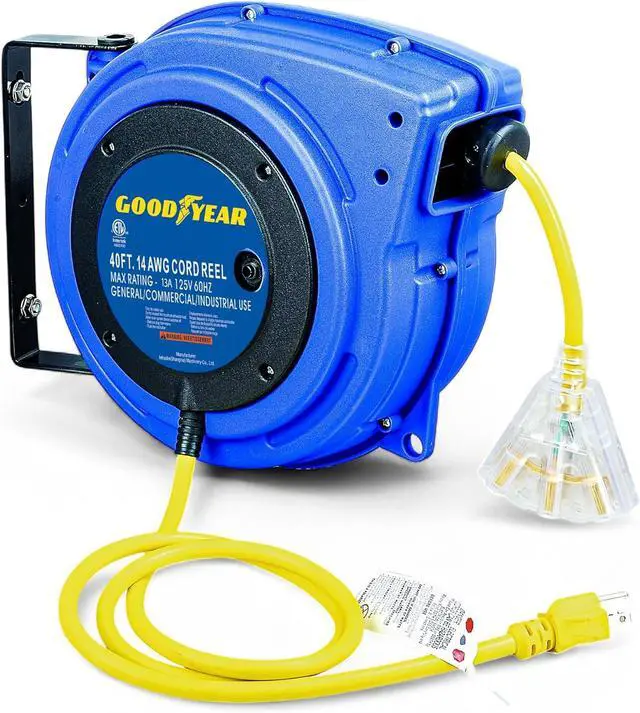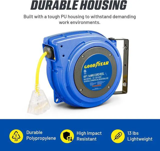 SAFETY and PROPER USE: Goodyear cord reels are best suited for indoor use, night or day environments, for DIY or industrial applications, allowing extension to be properly stored, keeping the workplace safe and clean.