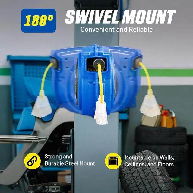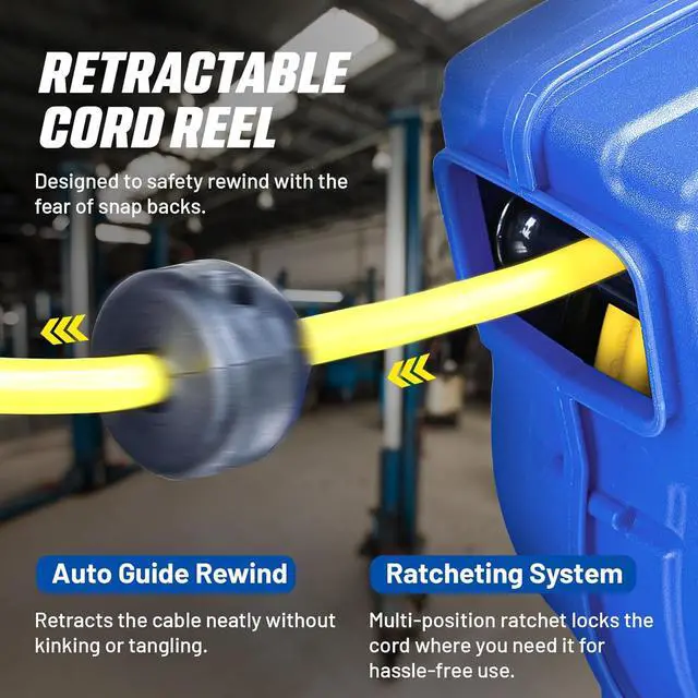 COMMERCIAL DESIGN: This Extension Cord Reel is constructed of hard impact Polypropylene Enclosed Spring Driven Case. The reel utilizes double adjustment improved ratcheting that locks the cord at any desired length.
