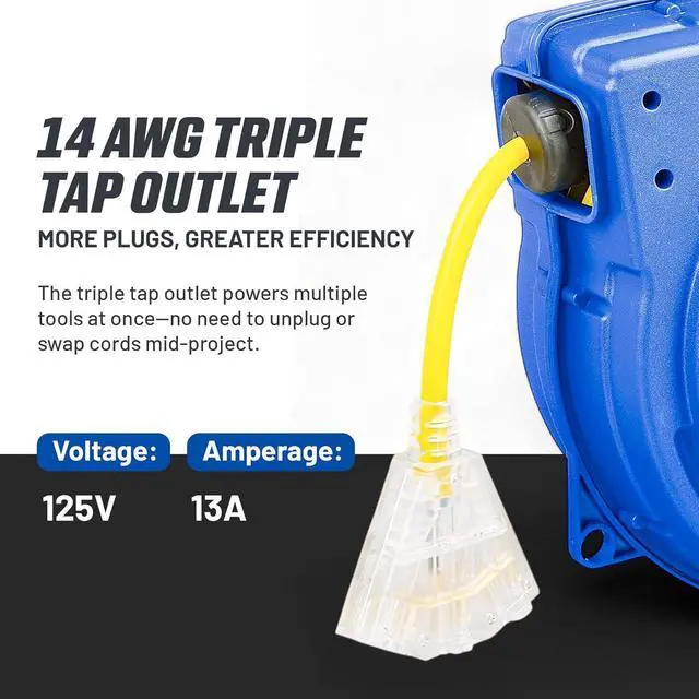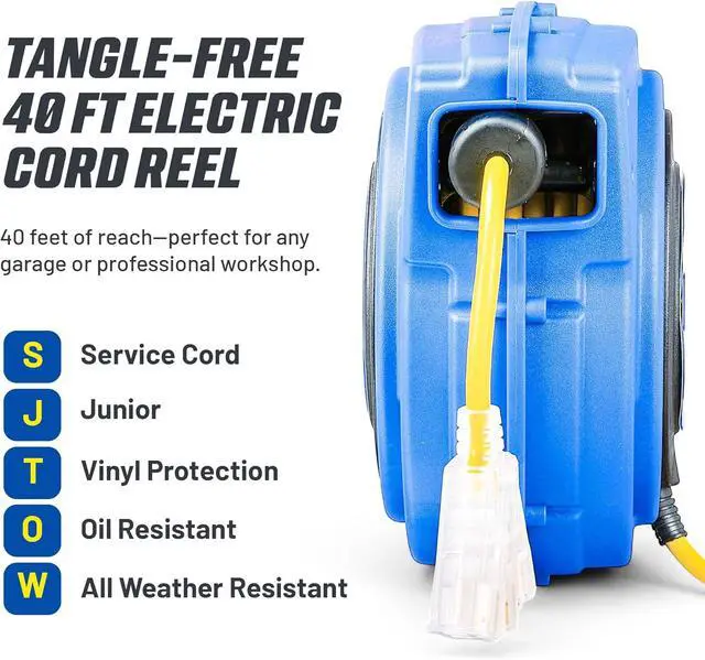 UNIQUE FEATURES: This Cord Reel utilizes with a 3-prong plug NEMA 5-15R / NEMA 5-15P and includes a 40'' inch Cord, Adjustable Cable Stopper and 2 Non Snag Rollers to reduce cord abrasion; Circut Breaker included to protect reel and operator