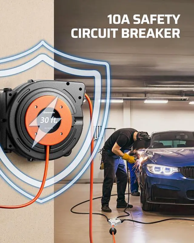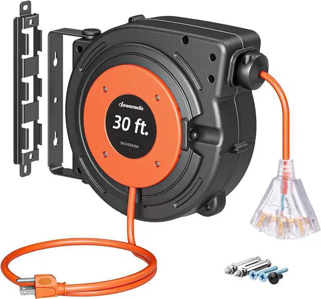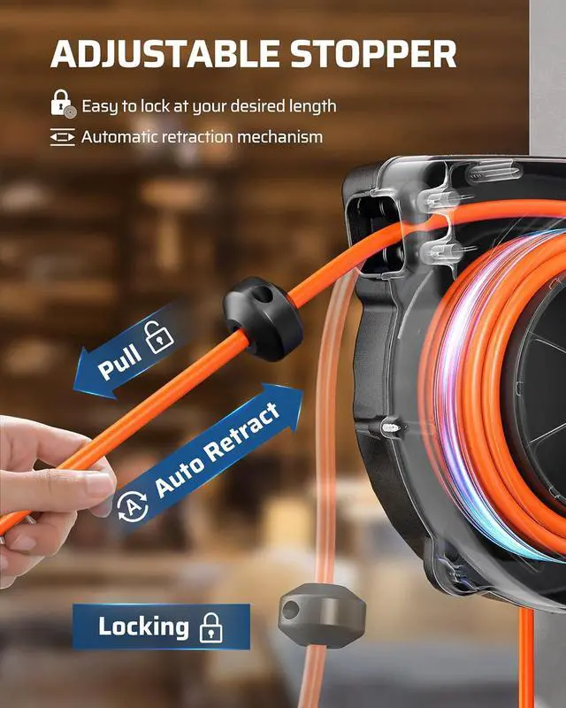Crafted with a flame-defying, tangle-repelling, and abrasion-banishing 16AWG/3C SJTW retractable extension cord.