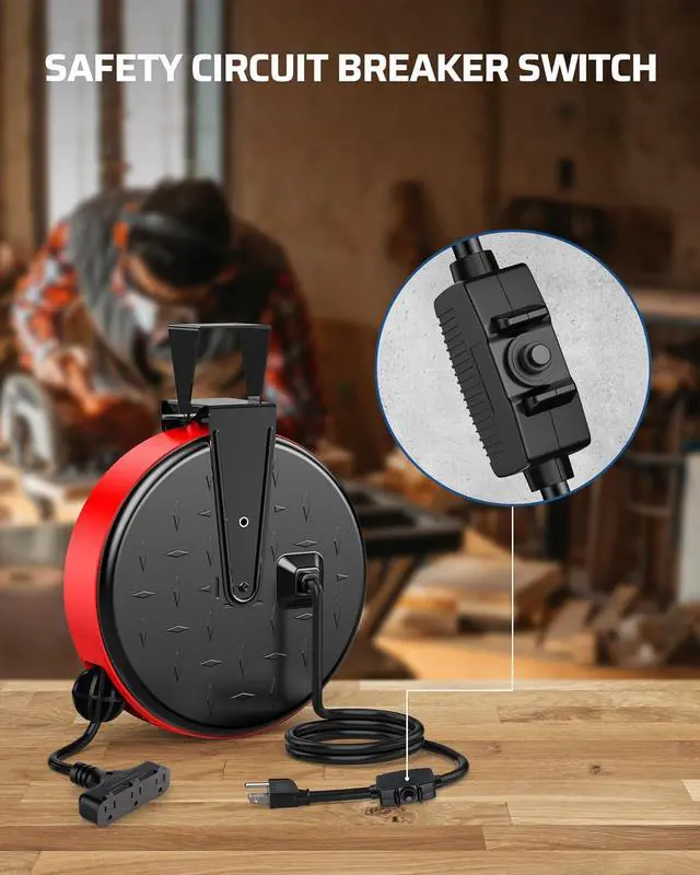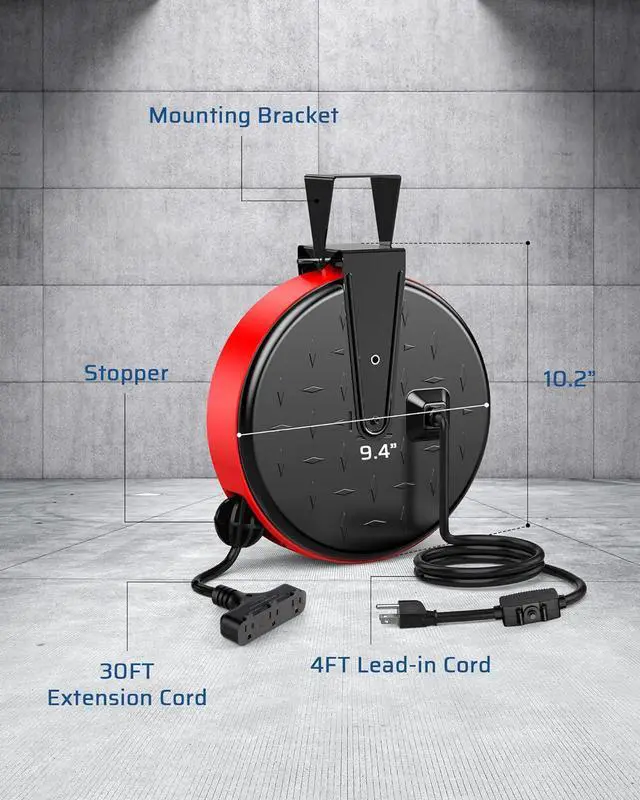 30 Foot 16/3C Gauge Power Cord & 4 FT Lead In Cord Rated for 10A/ 125V/ 1250W, the electric cord reel power station has 30 feet long SJTW extension cord and 4 feet lead-in cord; the stopper is not adjustable, which can effectively prevent the extension cord from fully retracting into the reel
