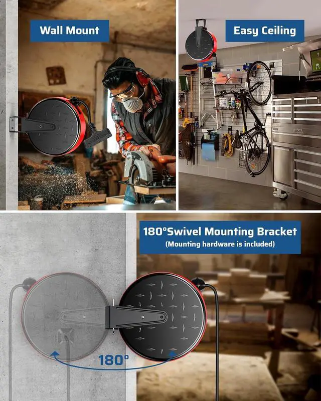 Easily Ceiling / Wall Mount with 180 Degree Swivel The swivel mounting bracket lets the extension cord reel swivel freely up to 180 degrees; perfect for hanging from your garage ceiling or mounting to a wall;easily pull and release cord from multiple directions; free up more work space and makes storage a breeze; avoid tangled cords or people tripping up