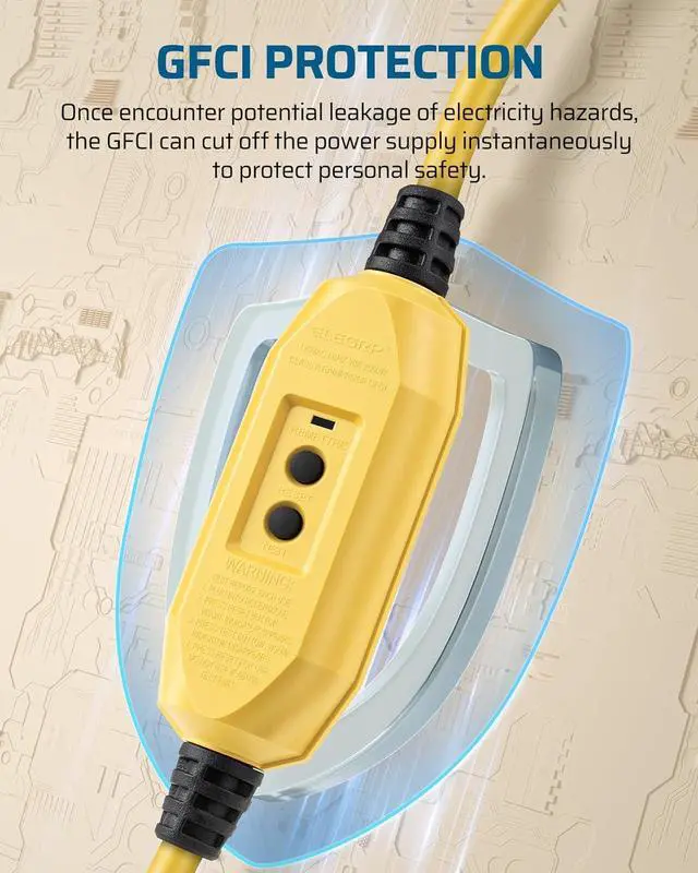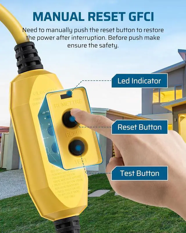 Manual GFCI Protectionattached GFCI ensures more safety when in use, provide electric shock protection and prevent the risks of electrical fire caused by ground fault; it need to push the reset button to restore the power after interruption,please check your devices before push it to ensure the safety