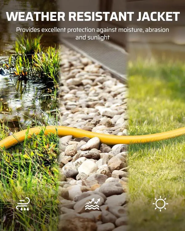 Heavy Duty Cord 15A / 125V / 1875W; premium SJTW 12/3 gauge contractor grade power cable has thicker, 600-volt insulation, designed for heavier use, leaf blower, lawn mower, pressure washer, weed whacker, electric drill, power saw, or Christmas holiday lights