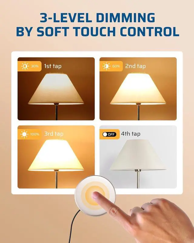Touch Panel Dimmer Control - Touch anywhere on the touchpad simply to dim your lights with 3 dimming levels; 1st touch to get 30% brightness; 2nd touch to get 60% brightness for normal room light; 3rd touch to get 100% brightness for reading; 4th touch to completely turn off power; side outlet is perfect for tight spaces gone and behind furniture