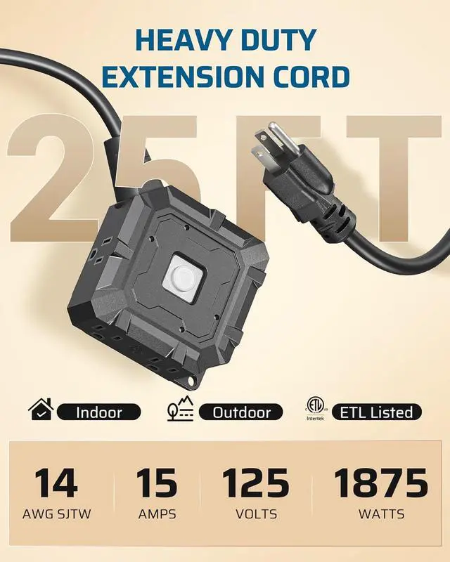 [6 Outlets Plug Tail] Designed for convenience, the 25ft extension cord features a compact design with 6 outlets at the end, allowing you to power multiple devices at once without worrying about outlet shortages; built-in indicator light on the plug glows when powered, providing a clear visual confirmation of power status