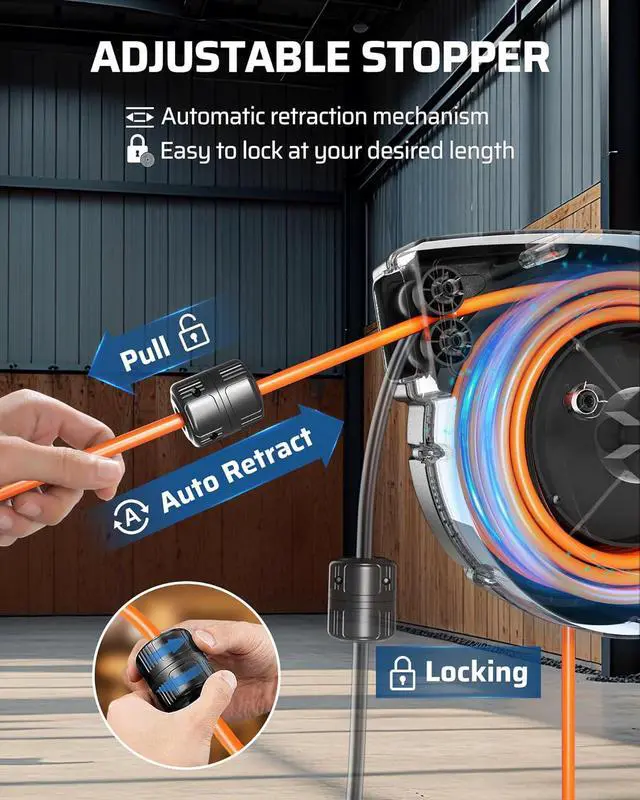 [Auto-Retract & Safety Lock] With an automatic rewind mechanism and adjustable stopper, the extension cord wheel retracts smoothly without tangling; lock the cord at any length, and retract it at a steady speed, safe for children, pets, and the elderly