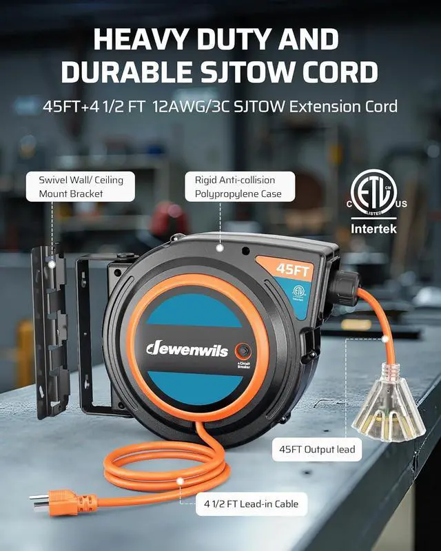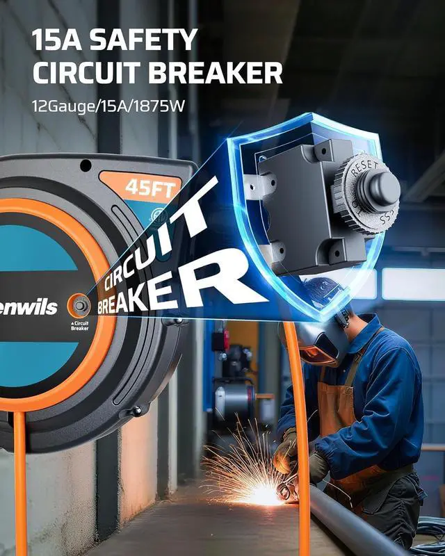 [15A Circuit Breaker] Integrated 15A circuit breaker cuts off power automatically when overload occurs, protecting your tools and devices from damage; ETL-certified power cord reel for superior material quality and reliable performance