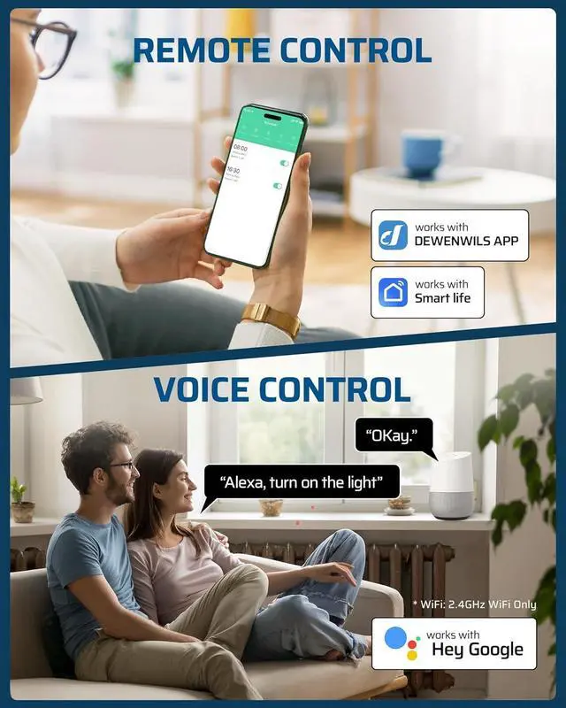 [Remote & Voice Control] Compatible with dewenwils and Smart Life App, Alexa and Google Assistant, this water heater timer allows you to turn on/off connected devices by your smartphone from anywhere or via simple voice commands, escape yourself from going outside to turn them off in bad weather; supports 2.4 GHz Wi-Fi network only