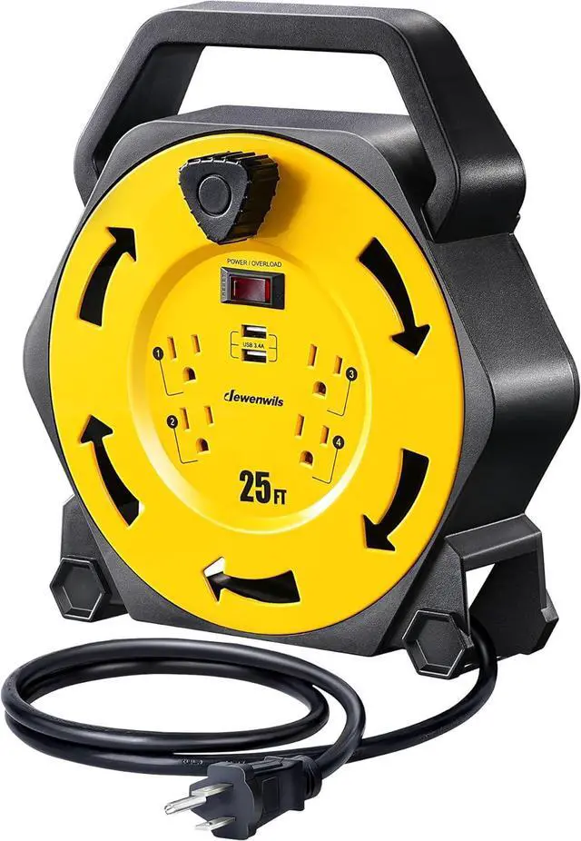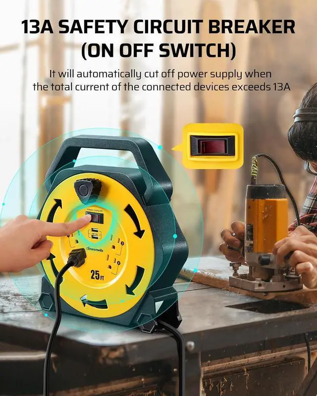 4 Built-in Grounded Outlets Rated for 13 Amps, 125Volt, and handle up to 1,875 watts of power, the heavy duty electrical cord reel power station has 4 built-in grounded outlets, will let you use multiple machines without having to unplug your other devices