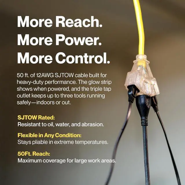 REEL SPECS - The 12AWG x 50' Foot 3C/SJTOW Florescent Glow Strip Cord and Lightup Triple Tap (S3) Connector; The 3 Core Wire Grounded Cable is rated at 15A 125VAC 1875W 60Hz; cETLus, Intertek GS Listed approved and certified, including quality tested