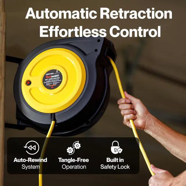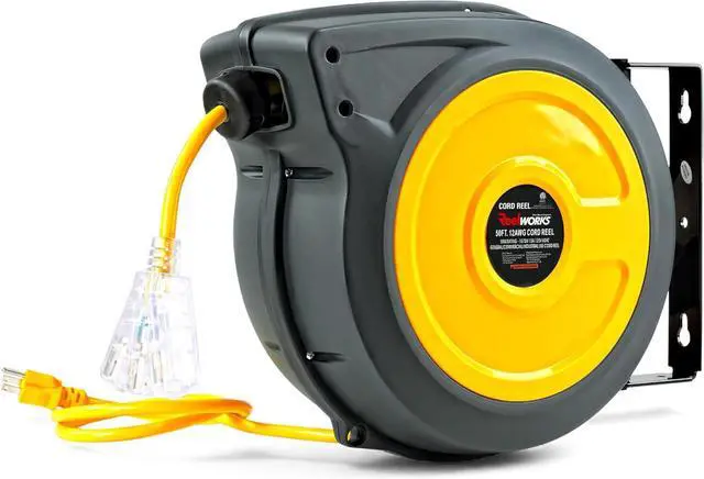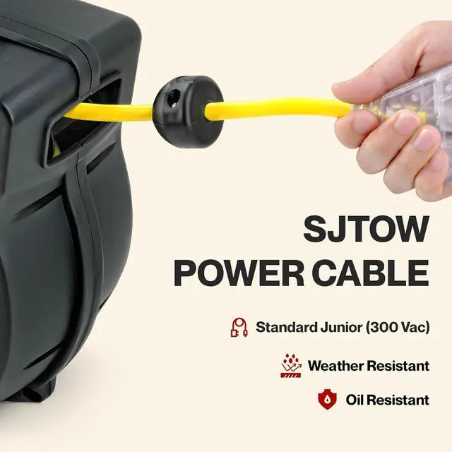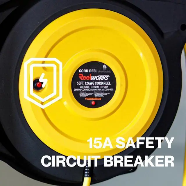 UNIQUE FEATURES - This reel utilizes a NEMA 5-15R/NEMA 5-15P 3-prong plug, Lightup Tap and includes a 60" inch Lead-in Cord; Adjustable Cable Stopper and 2 Non Snag Rollers to reduce cord abrasion; Circut Breaker included to protect reel and operator