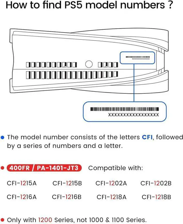 • Perfectly Fitment:For PS5 Power Supple Model forCFI-1215A/B,CFI-1202A/B,CFI-1216A/B,CFI-1218A/BCompatible only with 1200 Series, not 1000 & 1100 Series