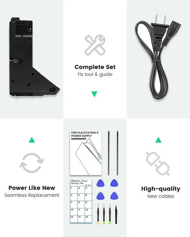 Power Supply Replacement Kit specifically designed for PS5 - Easily solve the problem of boot-up failure & frequent reboot! Key Features: Qriginal -Level Quality Precision-engineered internal power supply for PS5,delivering stable power flow and enhanced durability. Complete Tool Kit & Accessories Includes a set of screwdrivers and other essential tools - everything you need for an easy installation! Step-by-Step Guide Comes with an illustrated manual, making replacement easy even for beginners. No need for expensive repair services! ncludes a Compatible Power Cable Ready to use right out of the boxno extra purchases needed! Order Now and Revive Your game consoleGet Back to Gaming in No Time!