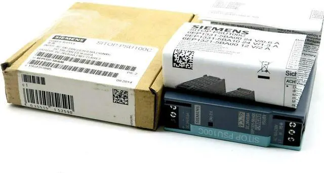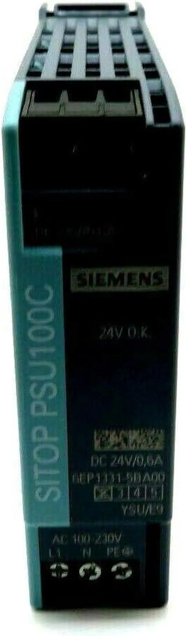 Siemens 1-Phase Sitop PSU100C stabilized power supply has input voltage rating of 100 - 230 Volt/85 - 264 Volt AC/110 - 300 Volt DC and output voltage rating of 24 Volt DC. It has current rating of 0.28 - 0.6 Amp. This power supply with screw terminal connection, has power rating of 14 Watts and efficiency of 82%. This supply supports DIN rail mounting for easy installations. It has IP20 degree of protection. This supply features green LED for "output voltage OK". It measures 22.5 mm x 80 mm x 1