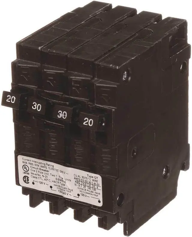 Siemens space saving, plug in circuit breakers are intended for use in Siemens EQ, Siemens Ultimate, ITE, and Gould load centers and meter combinations that are rated to accept type QT breakers. Check wiring diagram to confirm. To ensure the warranty on a Siemens panel is not voided, the use of Siemens breakers is required. The triplex breakers provide two single pole and one double pole breakers in half the space. These triplex, 1/2-Inch frame breakers are ideal when new circuits are required in a panel that has no available spaces. Siemens strongly recommends against the use of "used" breakers. The installation of used breakers in a Siemens panel will void the warranty on the panel. Siemens does not sell used breakers and has not approved any 3rd party sellers to do so.