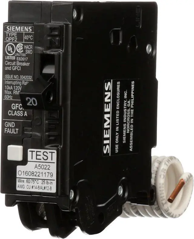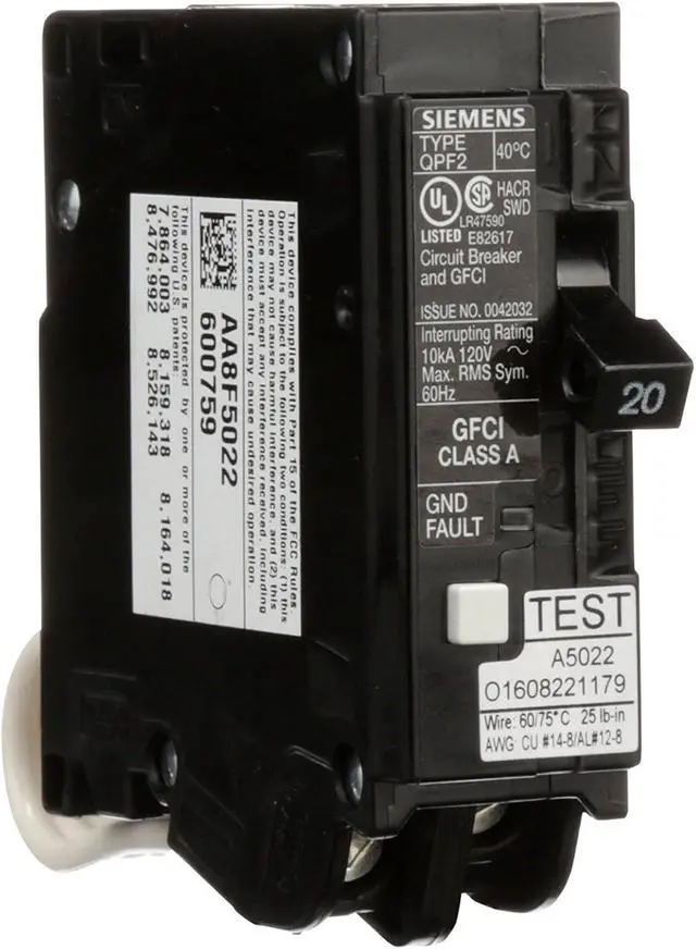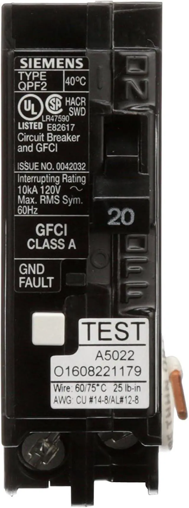 Siemens QF120A Gfci Circuit Breaker, Plug in, Self Testing, 20 Amp, 1-Pole, 120 Volt