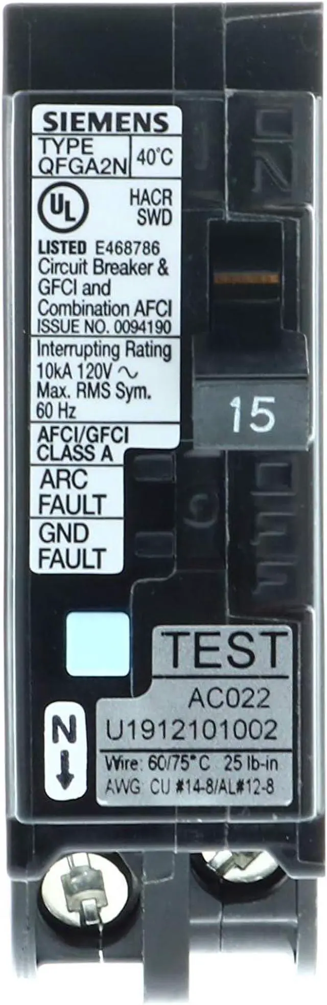 Siemens Q115DFN 15 Amp 1-Pole Dual Function (CAFCI/GFCI) Plug-On Neutral Circuit Breaker, Black