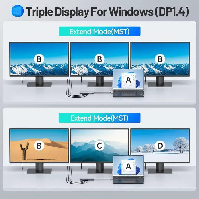 18K/30Hz Single Monitor2Triple Monitors for Win3Triple Monitors for macOS4Quad Monitors for macOS5macOS: no MST support USB C Docking Station 4 Monitors 8K USB-C Hub Multiport 13 in 1 Dongle Adapter