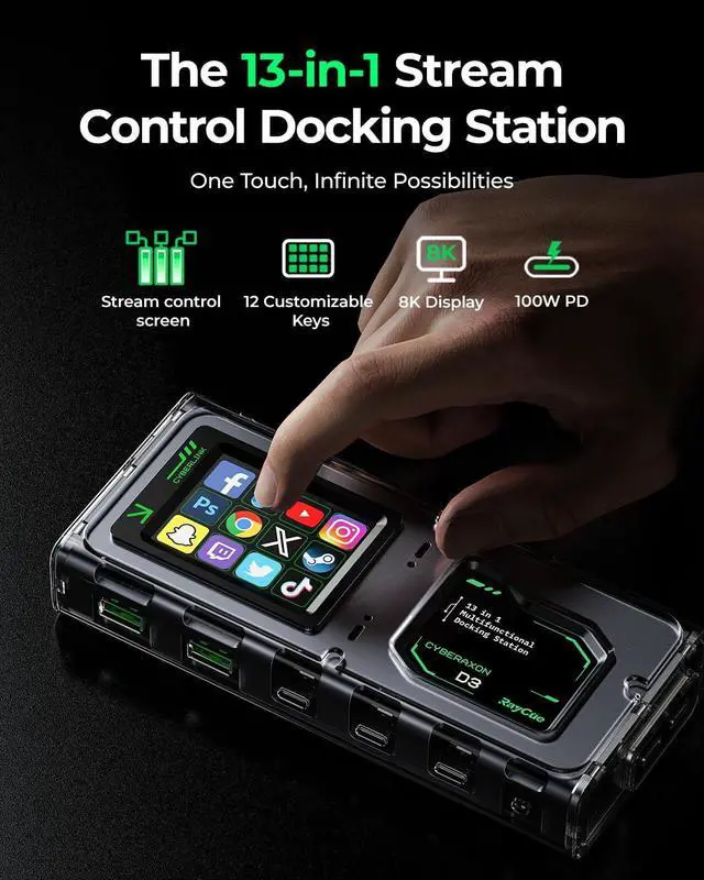 Stream Control Touchscreen with 12 Programmable KeysExperience Stream Deck-like control built right into your dock! The 2.4" IPS touchscreen delivers instant access to your favorite apps and settings. 12 fully customizable keys let you control volume and media playback, switch displays with one tap, launch apps instantly, and manage live streams effortlessly. Download the RayCue CyberAxon app for customization.