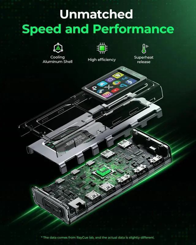 Sleek Cyberpunk DesignTransparent casing with aluminum alloy cooling, LED lights & compact build for a futuristic look. Ideal for USB-C docking station dual monitor setups & laptop docking stations.