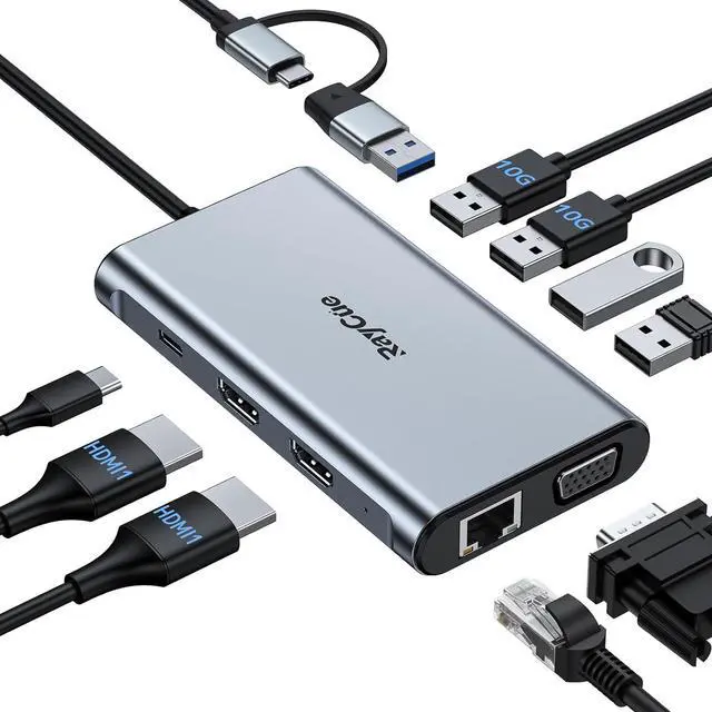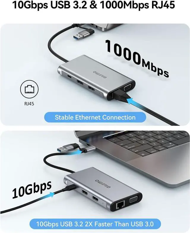 9 IN 1 USB C Docking Station: Convert your USB-C /USB-A port into 2 HDMI ports, 1 VGA port, 2 USB 3.1 ports, 2 USB 2.0 ports, and 1 USB charging port. Our dual monitor docking station expands your work opportunities and provides you with more stable performance. (The USB-C charging port is only designed for our USB docking station charging (not support charging for laptops)(NOTE: download the driver "Siliconmotion" before using the docking station)