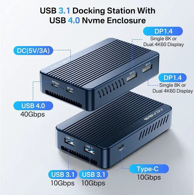 6-In-1 ACASIS Dock With 40gbps nvme enclosureTBU405Plus features 2*DP1.4, 2*USBA 10Gbps, 1 USB C 10Gbps. Whether it's expanding screens, computer interfaces, or memory, this product has you covered.