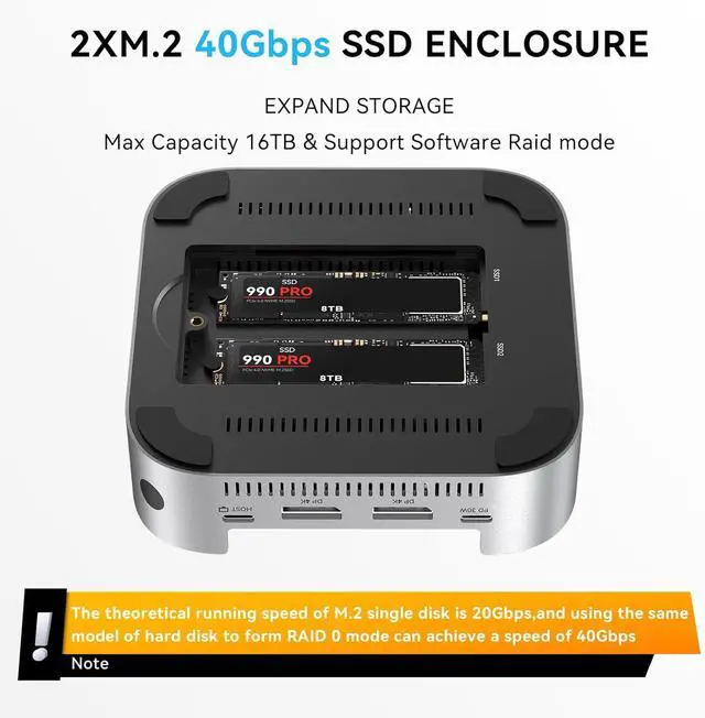 Up to 16TB Expandable Storage Supports 2×NVMe SSDs, delivering up to 16TB at 2869MB/s in RAID 0 mode or 8TB at 1594MB/s in other modes. Designed to expand Mac Mini storage and eliminate capacity concerns. The included 30W PD adapter provides stable self-power, minimizing the risk of disconnection, display issues, or drive failure. Do not plug or unplug SSDs while powered on.
