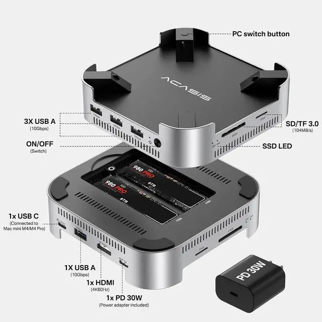 Up to 16TB Expandable Storage Supports 2×NVMe SSDs, delivering up to 16TB at 917MB/s in RAID 0 mode or 8TB at 474MB/s in other modes. Designed to expand Mac Mini storage and eliminate capacity concerns. The included 30W PD adapter provides stable self-power, minimizing the risk of disconnection, display issues, or drive failure. Do not plug or unplug SSDs while powered on.