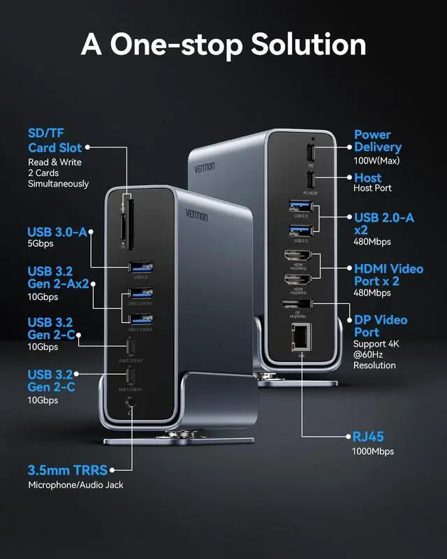 16 IN 1 USB C Docking Station: VENTION laptop docking station features 2×4K@60Hz HDMI Ports, 4K@60Hz DP Port, 10Gbps USB C Port, 2x10Gbps USB A Ports, USB C Port, USB 3.0 Ports, 2xUSB 2.0 Ports, 100W Power Delivery (PD) Port, 3.5mm Audio Port, SD/TF Reader, PC Host Port and RJ45 Gigabit Ethernet, catering to all your daily needs