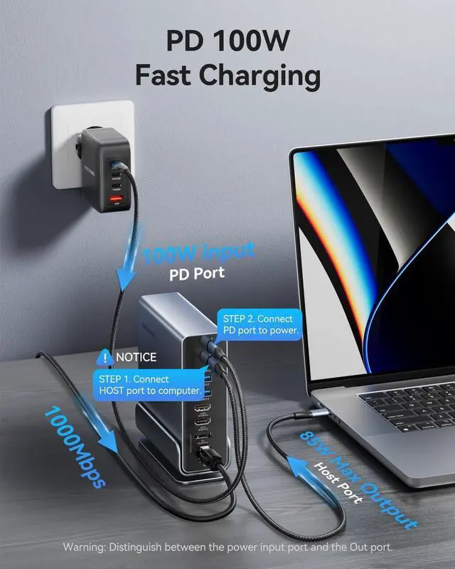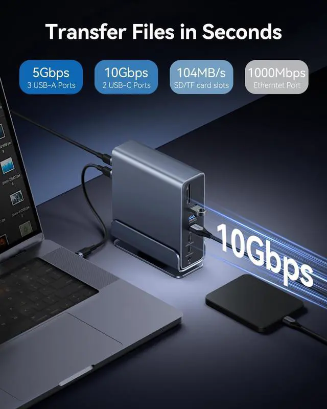 • 10Gbps Data Transfer&Gigabit Ethernet Port: The front of the laptop expansion dock includes 10Gbps USB-A & USB-C data ports, USB 3.0 and USB 2.0 ports, perfect for high-speed data transfer. It also includes a 100W PD port for rapid charging of your laptop, (1*USB-C 4.