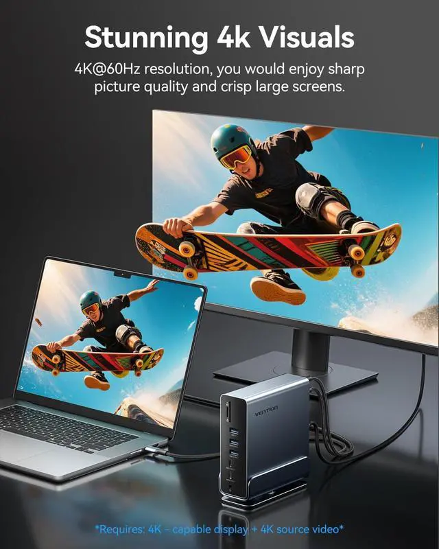 • 16 IN 1 USB C Docking Station: VENTION laptop docking station features 2×4K@60Hz HDMI Ports, 4K@60Hz DP Port, 10Gbps USB C Port, 2x10Gbps USB A Ports, USB C Port, USB 3.0 Ports, 2xUSB 2.0 Ports, 100W Power Delivery (PD) Port, 3.5mm Audio Port, SD/TF Reader, PC Host Port and RJ45 Gigabit Ethernet, catering to all your daily needs