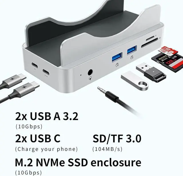 6-in-1 connectivity: Equipped with 2× USB-A 10Gbps ports, SD/TF card slot (shared USB 3.0 interface), and a 3.5mm audio jack for headphones or microphones. Compatible with macOS, Windows, Linux, and Android. Ideal for creators, photographers, home studios and minimal desk setups. Tipps: The 5V port provides additional power to the docking station itself to ensure stable operation when connecting high-power USB devices.