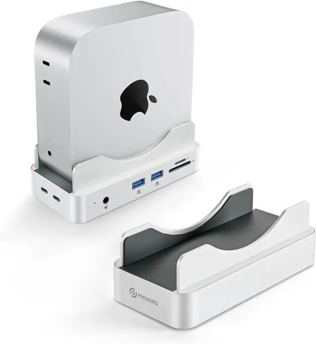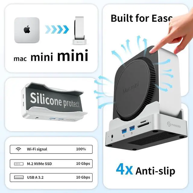 Premium aluminum build to match Mac mini: PHIXERO PSE Mac mini M4 Stand crafted from premium aluminum alloy and plastic with anti-slip silicone pads and a silver finish. Sturdy aluminum enclosure provides better heat conduction and ensures long-term durability. It's durable, stable, and seamlessly cohesive with your Mac mini.