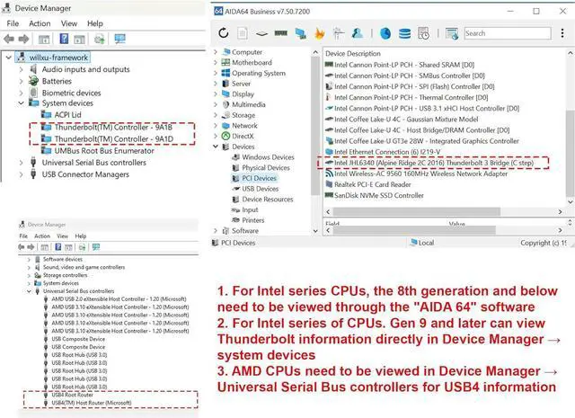 NOTICES BEFORE PURCHASING: Before purchasing, please check whether your hardware system supports USB4, Thunderbolt 3 or Thunderbolt 4. 1. For intel CPU series, you can view thunderbolt-related main controllers in "Device Manager-system devices"; Before the 8th generation of intel, you need to view the main control through AIDA64 software. 2. AMD CPUs can be viewed in "Device Manager-Universal Serial Bus controllers" to see USB4 related controllers. In summary, as long as you can see thunderbolt and USB4 information in the system hardware, they can be compatible with this eGPU enclosure. If not, it is incompatible and cannot be purchased.