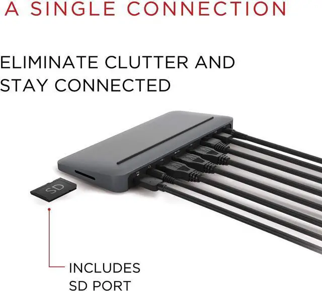 Connect all of your peripherals with one, single cable. Stone features three USB 3.1 ports, Mini DisplayPort, audio, ethernet, power supply, SD Card reader, and a USB-C data/charging port.