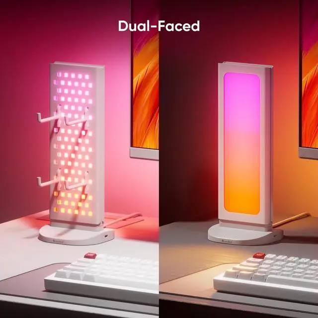 [Dual Faced Lighting] Use the light pegboard side to store & display accessories, or turn 180º for full-faced lighting effects. Simply click, lift & rotate!