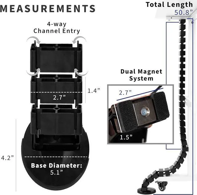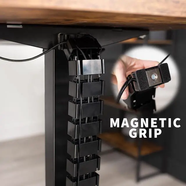 Magnetic Vertebrae Cable Management - Flexible cable channel attaches to any metal portion of your desk frame with an easy magnetic end measuring 2.7" x 1.5". Designed to protect and organize AV and power cords, it works with both height adjustable and stationary desks alike.