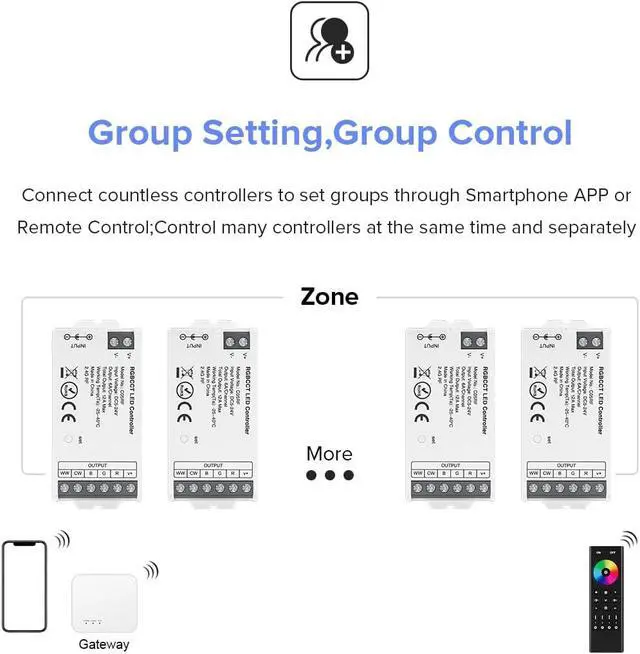 Suitable for the project: 1. Multi-zone control, multiple controllers required. 2.Need 2.4GHz RF Remote Control or TuyaSmart SmartLife APP WiFi Control. 3. No Bluetooth or Wi-Fi required. 4. Need Alexa or Google home remote voice control. 5.Cost effective LED project.