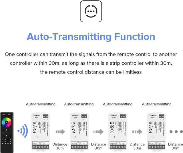 Automatic Transmitting Sync Function One controller can transfer the signal from the remote to the other controller within 30 meters. As long as there is an LED strip controller within 30 meters, the remote control distance can be unlimited. Auto-Sync function.Different controllers can work synchronously when started at different times, controlled by the same remote control in the same dynamic mode and at the same speed.