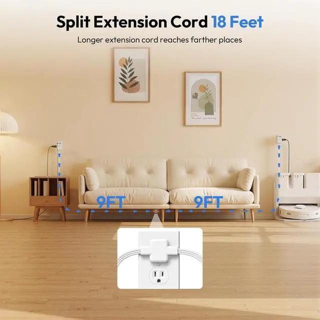 18 FT Double Extension Cord9 FT long cords on each male. The longger split extension cord gives you flexibility to reach distant outlets and hard to reach places. flat extension cord and flat plug design allows you to hide behind any TV, Couch, Sofa, Computer Desk, Dresser, Table, nightstand or Furniture to meet different needs.