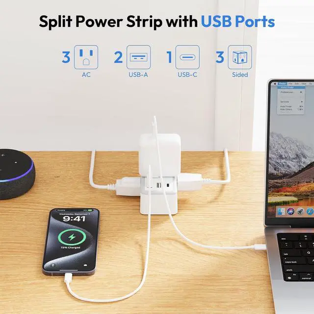 6-in-1 Dual Extension Cord × 2This double male extension cord has 3 AC outlets + 2 USB-A ports and one USB-C port each, and can charge a total of 12 devices on both sides at the same time. The 3 USB ports on each side provide stable 5V/3.1A output with a maximum output power of 15.5W. No need to buy additional adapters, reducing wire clutter.
