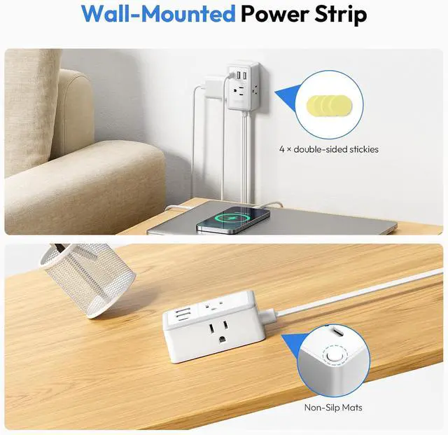 Compact 3-Sided DesignEach side is independently configured with 1 AC outlet to accommodate large adapters without any risk of blockage. The small extension cord has a mounting hole on the back for easy hangingWith 3M sticker, and the compact design helps you save space on your home and office desktop.