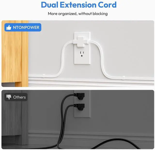 Ultra-Thin Flat PlugThe extension cord splitter has a flat plug design of only 0.31 inches, which can be hidden behind sofas, beds, nightstands, etc., and fits perfectly into the narrow gaps between walls and furniture. The flat extension cord wire can also be hidden under the carpet without any bulges, completely saying goodbye to messy cables.